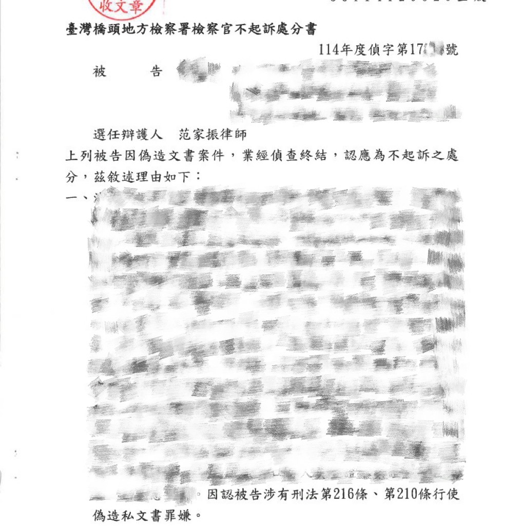 '; zoom view 當事人因個人資料保護法第41條非法利用個人資料、刑法第216條、第210條之行使偽造私文書、公職人員選舉罷免法第98條之2利用他人個人資料偽造提議等案件,委任本所范家振律師,獲不起訴處分